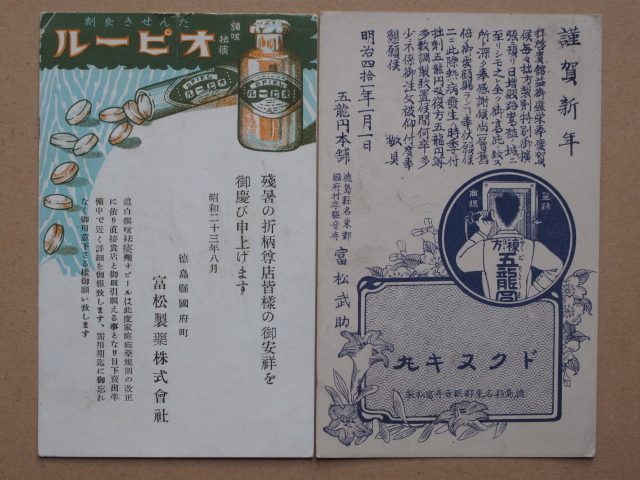 - 明治40年・昭和23年 製薬商 年賀状 暑中見舞 絵葉書 『 富松武助商店 』 計2点 実逓便 徳島県 名東郡 国府村 五龍円本舗 富松製薬