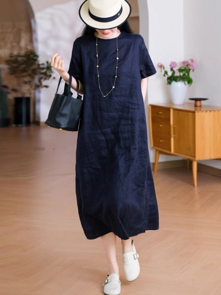 - 25nc ワンピース 無地 チュニック Aライン ナチュラル 高質 麻100% RINEN リネン ゆったり 肌触り通気性抜群 サラサラ 大人可愛 ネイビー