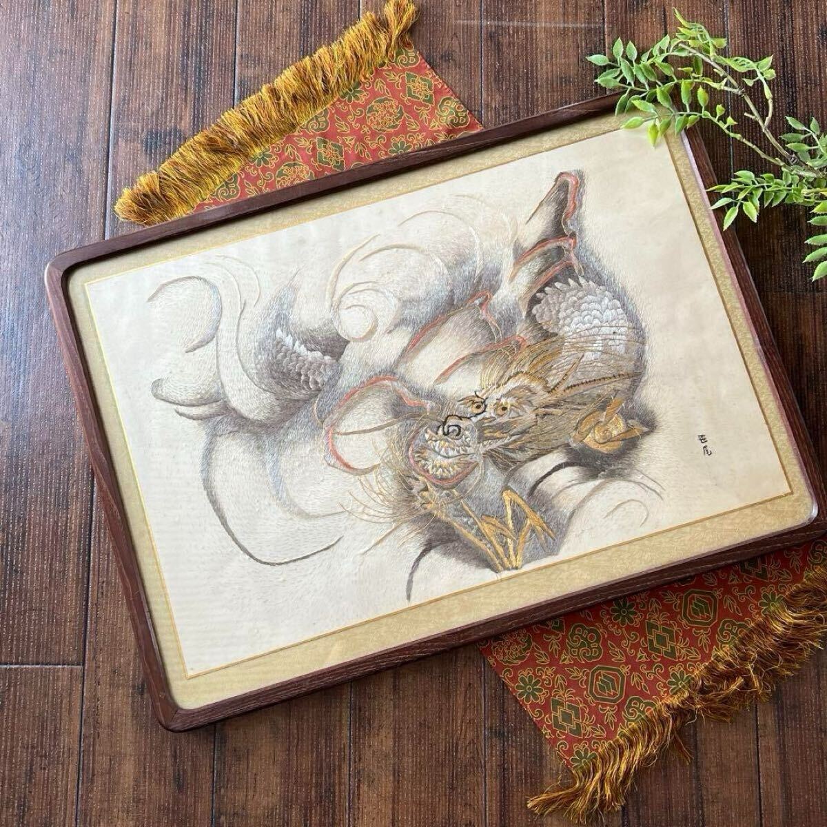 - wasabi k569 額装刺繍絵「雲龍」表情豊かなドラゴン 光と影を表すような逸品 吻 竜 ガラス板 和のインテリア ヴィンテージ 骨董品