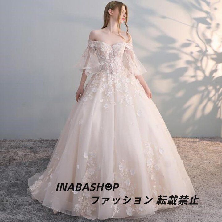 > ウェディングドレス ウエディングドレス オフショルダー 二次会ウエディングドレス 花嫁ドレス Aライン フレア袖 袖あり パーティードレス