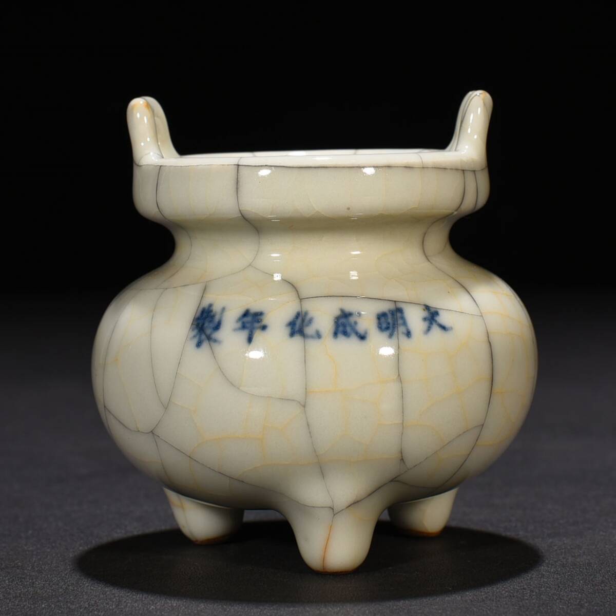- 明時代 成化年制 哥窯 三足両耳炉 陶磁器 中国美術 高さ8 cm 幅8 cm 骨董品 唐物 818