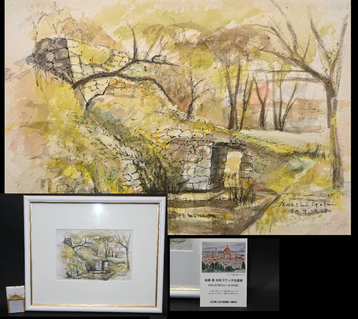> 真作■後藤隆 作■スケッチ『秋月城跡』ペン 水彩 サイン有 額装 個展ハガキ付 福岡県 風景画 景色 絵画 淡彩
