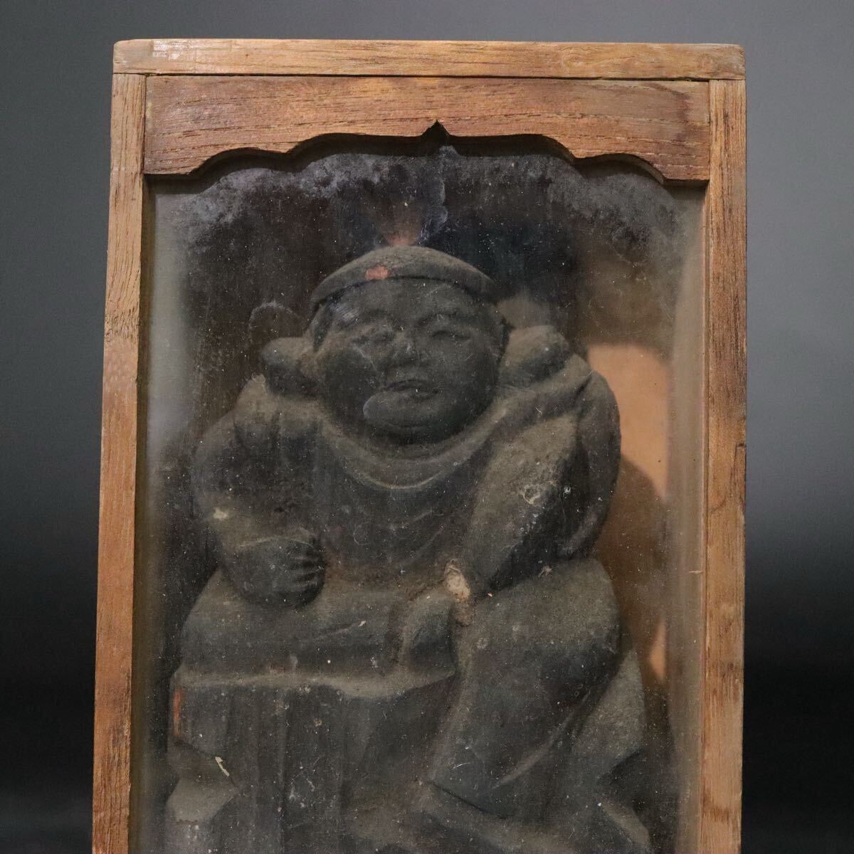 - 時代 木彫 恵比寿天 像 ガラス板嵌め 箱付 / 民仏 民衆仏 竈神 仏像 天然木置物 .B916