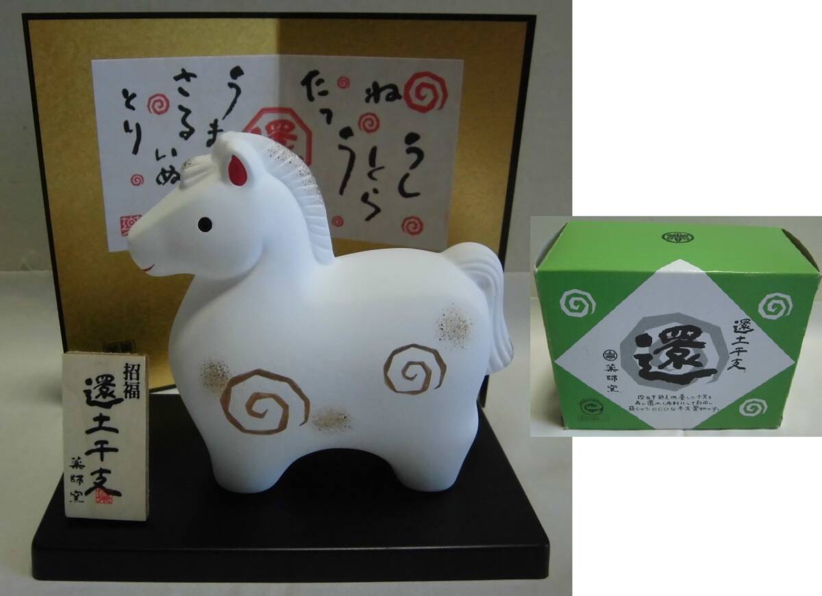 > 干支置物 午 還土 薬師窯 風 飾り台付き 箱入り 十二支 馬 うま 金彩 陶人形 土人形 招福 開運 縁起物 飾り物 陶器 工芸品 レトロ