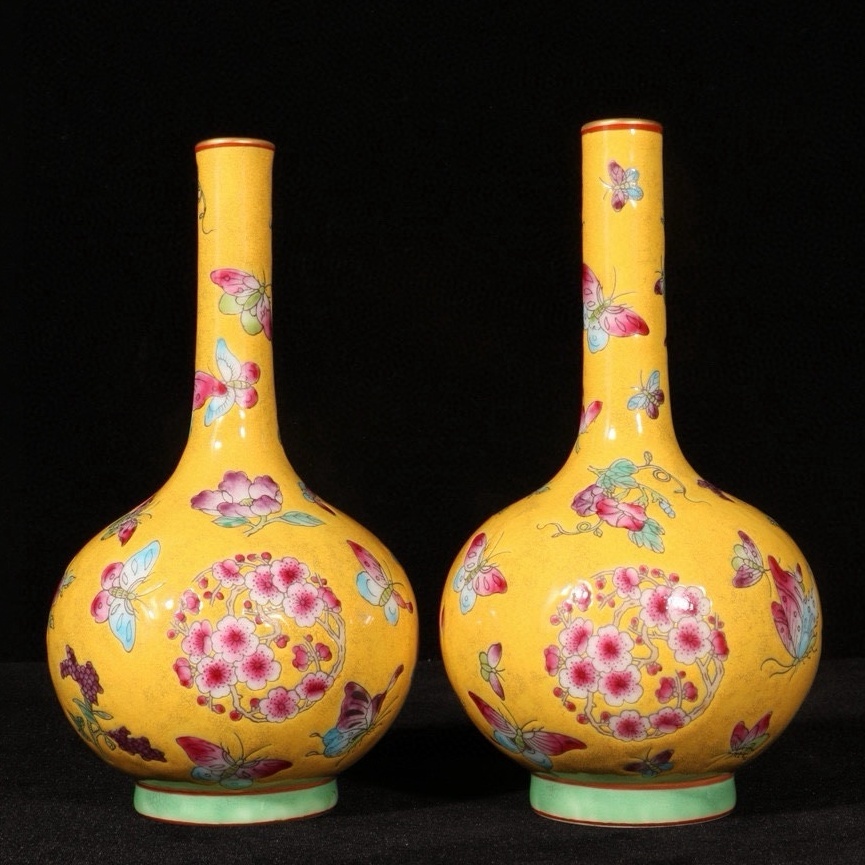> 珍しい 清時代 雍正年制 エナメル彩 蒔絵金 蝶恋模様胆瓶 古陶磁器 陶芸 中国陶瓷器 唐瓷 置物擺件 古美術品 古賞物 旧家蔵出 中国唐物 820