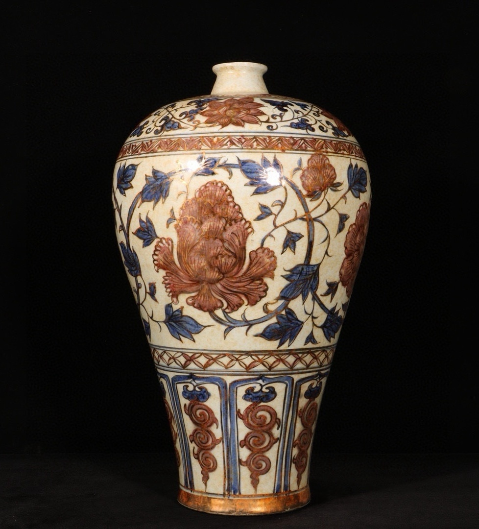 - 中国元代 青花 釉に赤 蒔金絡枝 牡丹紋梅瓶 時代物 陶磁器 中国美術 高さ44 cm 直径26 cm 骨董品 唐物 820