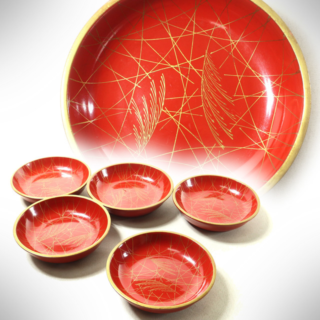 ●c036●【蒔絵日の出椀客 蒔絵 芒すすき 朱金縁】検お茶会茶懐石煎茶道具菓子皿吸皿酒木皿つまみ皿日の丸薄萱●西瓜●
