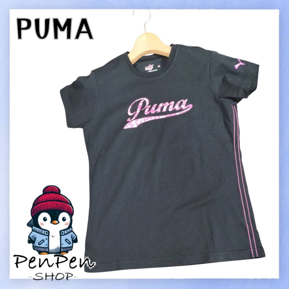 - PUMA プーマ レディース Tシャツ 半袖 ロゴプリント ストレッチ コットン×ポリエステル ブラック ピンクステッチ Mサイズ おしゃれ