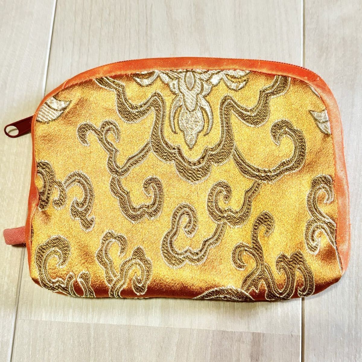 - オレンジ 金 唐草模様 中華伝統柄小物ポーチ 財布 アクセサリーポーチ シルク風 小物入れ