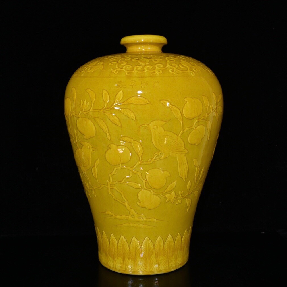 > ▽鴻▽ 明 永樂年製款 古陶瓷品 黄釉 開片 鳥食紋 梅瓶 陶藝 古賞物 古董品 時代物 稀少珍品 中国古玩 中国古美術