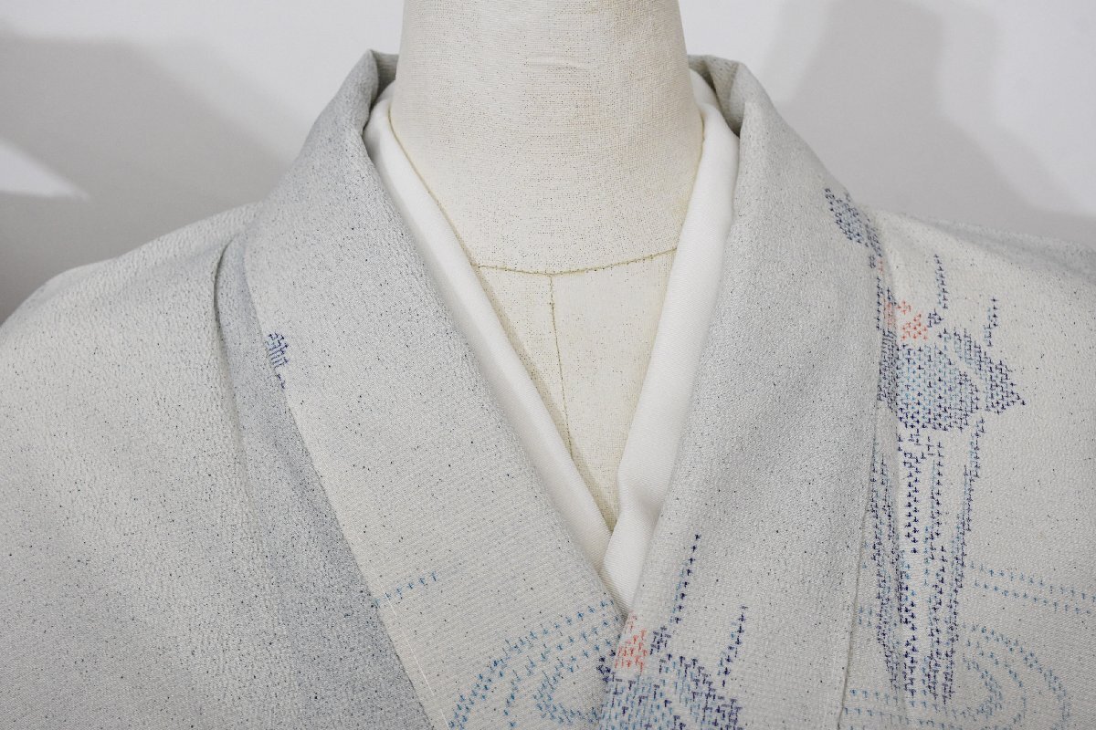 > 紬 つむぎ 杜若 水辺 単衣 身丈151cm 裄丈64cm ★着物 pb-3760 桜庭呉服店
