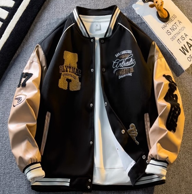 > 新入荷 春秋 スタジャン 刺繍 メンズ ブルゾン フライトジャケット 野球服 男女アウター PU袖 アメカジ 黒/XL