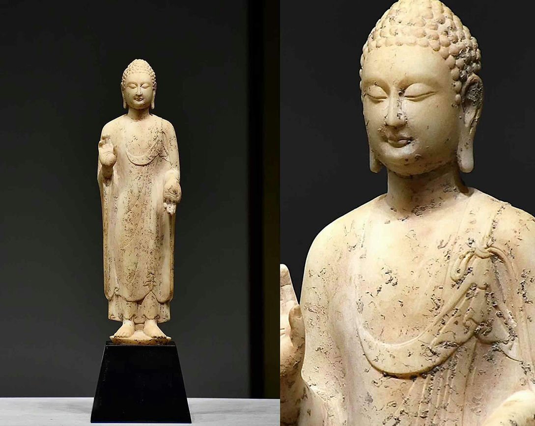 - ▼渡鶴羽▼R9623北斉時代 漢白玉立仏像 漢白玉石細工彫刻★仏教古美術★仏像★細密細工★廃寺旧蔵★廃寺買出品