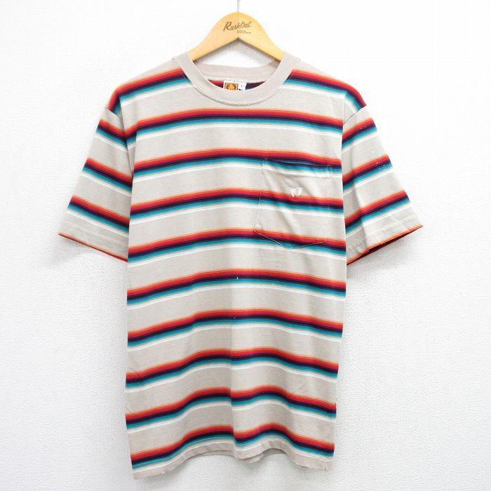 - XL/古着 ハンテン 半袖 ビンテージ Tシャツ メンズ 80s 胸ポケット付き クルーネック ベージュ他 カーキ ボーダー 25aug12 中古