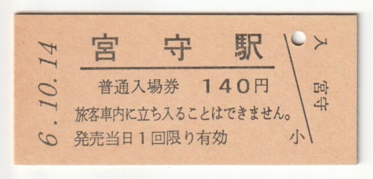 - 平成6年10月14日 釜石線 宮守駅 140円硬券普通入場券(日付印刷)