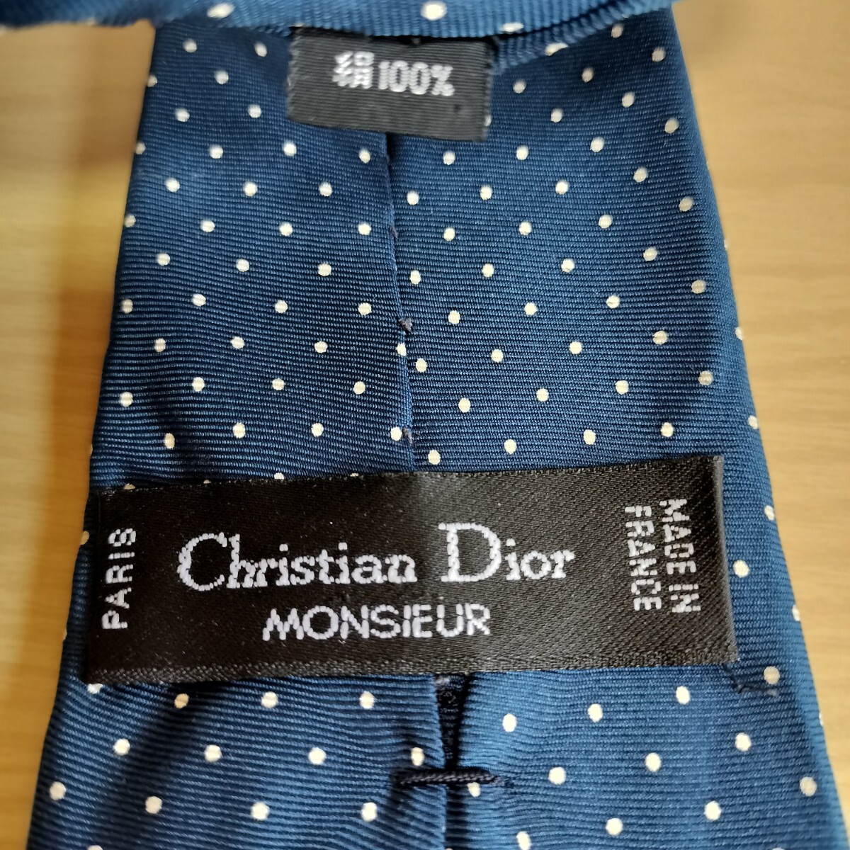 - Christian Dior(クリスチャンディオール)紺色白色ミニ丸ドットトロッター柄模様ネクタイ①