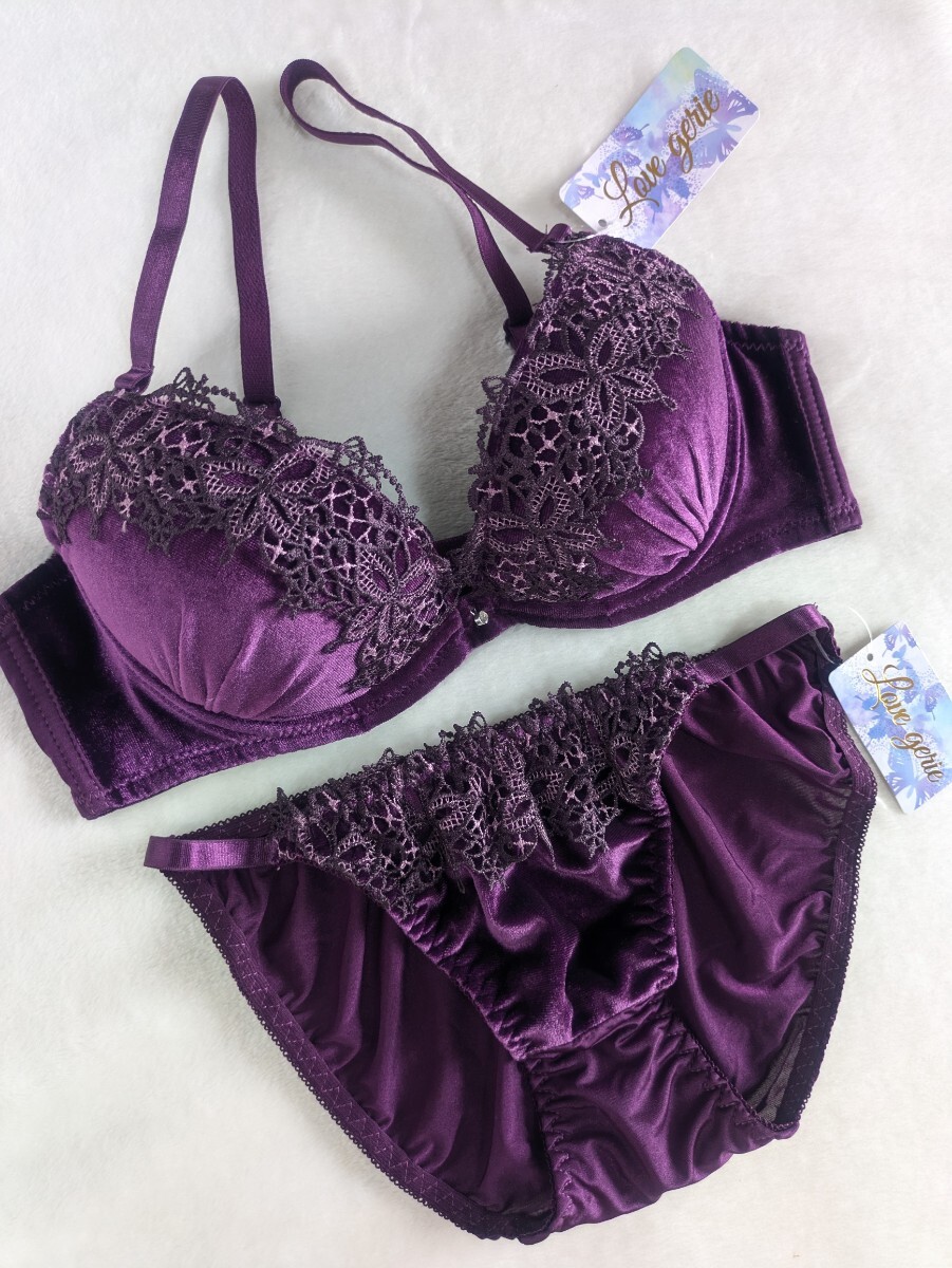 > お泊まりに☆D70ブラ&パンティ上下お揃い☆未使用☆セクシーレース&サイドストリング☆ベルベット風パープル☆匿名配送可☆タグあり☆