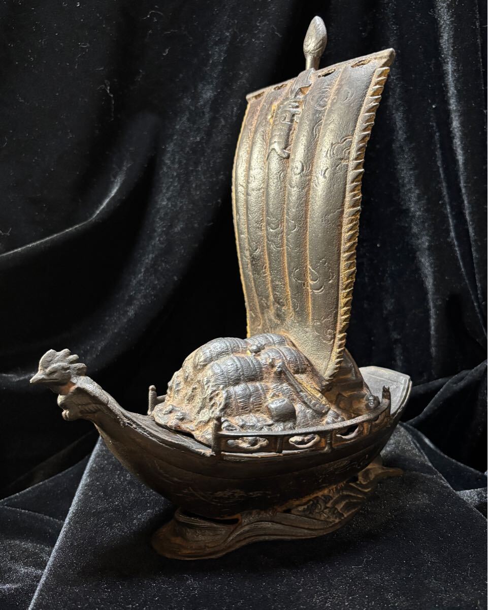 - 【古美術】時代物 金属工芸 金属置物 香炉 置物 鉄製 インテリア 宝船香炉 金属香炉 コレクター収蔵品 金属工芸 鋳鉄