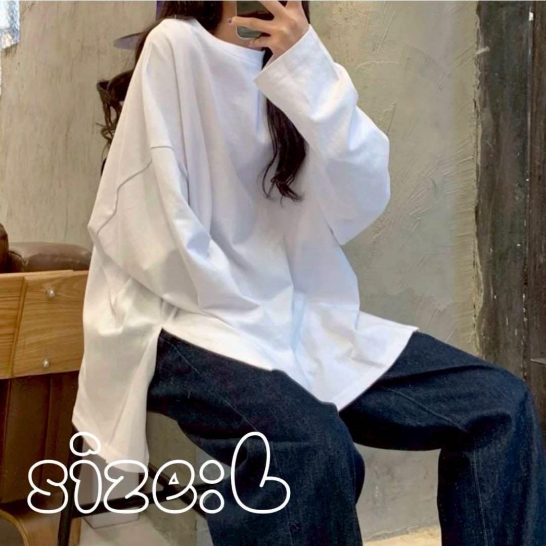 - ロンT レディース 長袖Tシャツ ビッグシルエット ゆったり 無地 ホワイト L