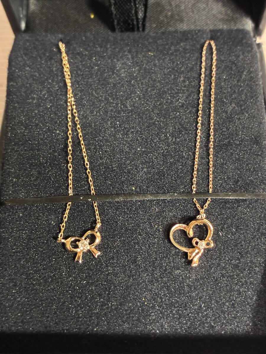 > 2本セット k18YG ネックレス ダイヤハート ダイヤリボン 750 k18金ネックレス イエローゴールド 刻印あり 中古 状態良