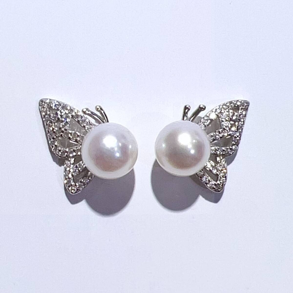 > Tensei Pearl 天成真珠 SV925 天然 AKOYA アコヤ キュービックジルコニア 蝶モチーフ ピアス ホワイト シルバー CZ P7.0mm 2.4g 保証書 箱