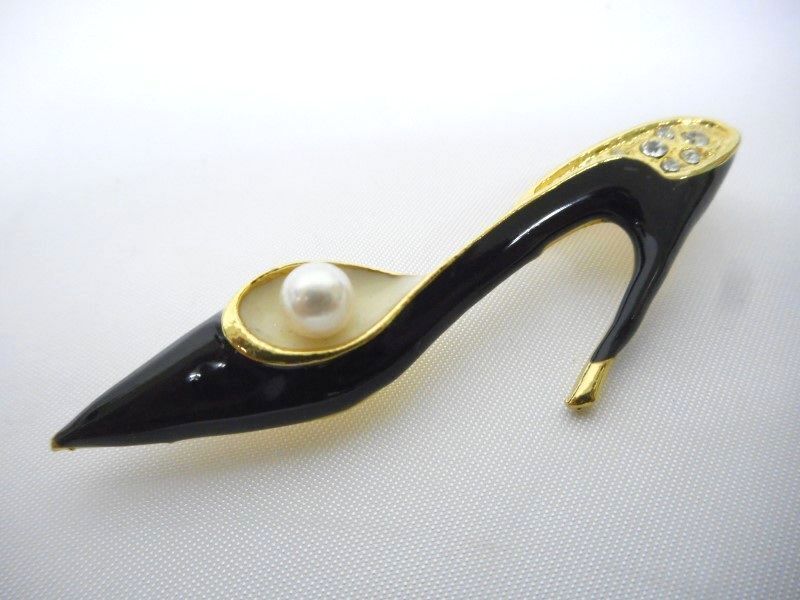 - ブローチ ピンヒール パール ブラック×ゴールド ラインストーン M-042