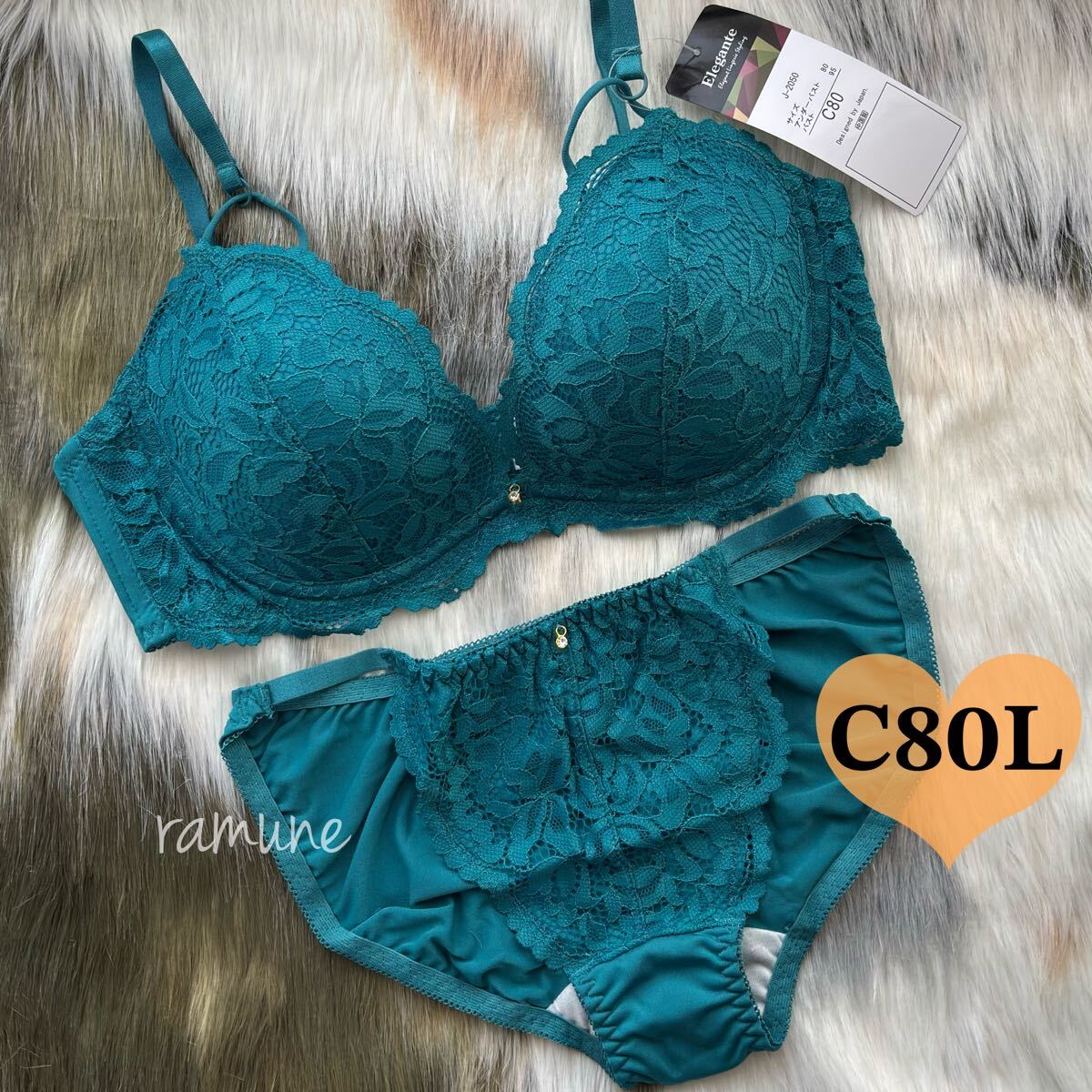 > 【C80-L グリーン系 上下】新品 ブラ&ショーツセット ブラジャー ショーツ パッド内蔵 レース 立体カップ 寄せ上げ グラマー Cカップ