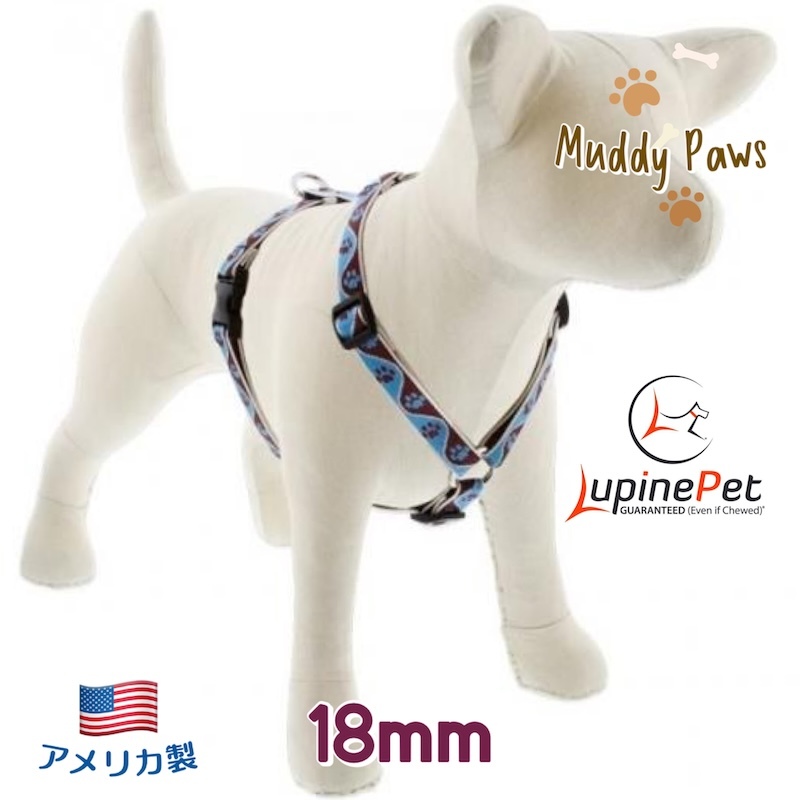 > ローマンハーネス・Lサイズ 18mm幅ブルーパウ柄Muddy Paws 50-81cm LUPINEルパイン アメリカ製 軽量丈夫 製造終了レア
