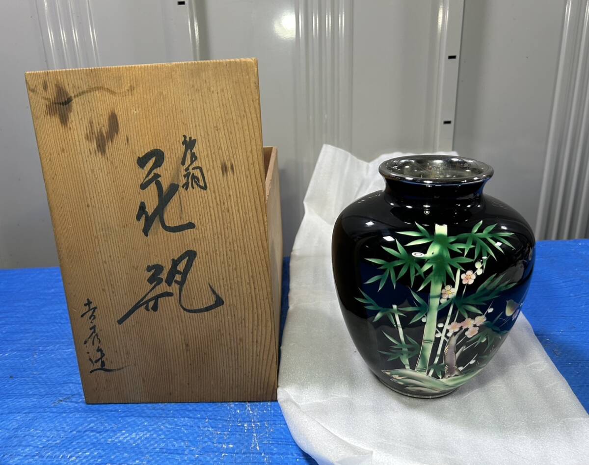 - 【希少価値品 書道先生放出品】七宝焼 黒翠 陶七宝 花瓶 昭和レトロ 壺 花入 生け花