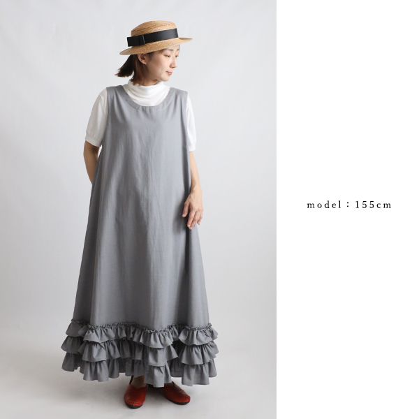 - 秋の新作 124cm丈 ギマ擬麻コットン 贅沢裾フリル ノースリーブ ロングワンピース ジャンスカ グレー F23A