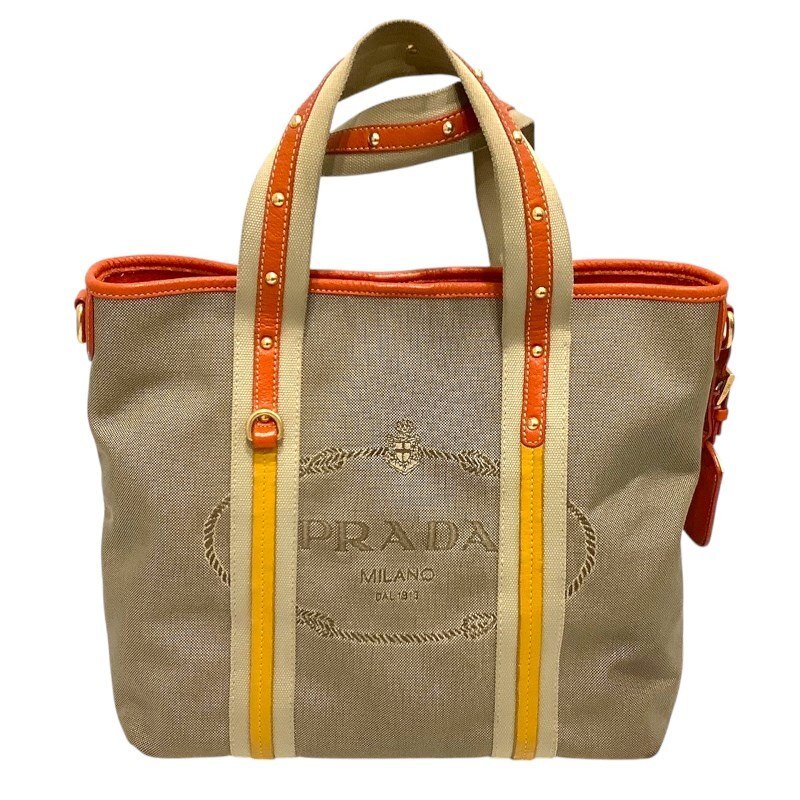 - PRADA プラダ ジャガード スタッズ ロゴ ハンドトート バッグ ベージュ ギャラなし 【中古】 JA-24190