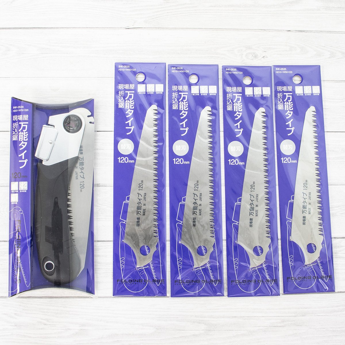 - 現場屋 万能タイプ 折込鋸 120mm 本体 INK-0534 / 替刃 INK-0535 / 5点セット 未使用品 長期倉庫保管品 のこぎり 一般工作 生木 剪定 仮枠
