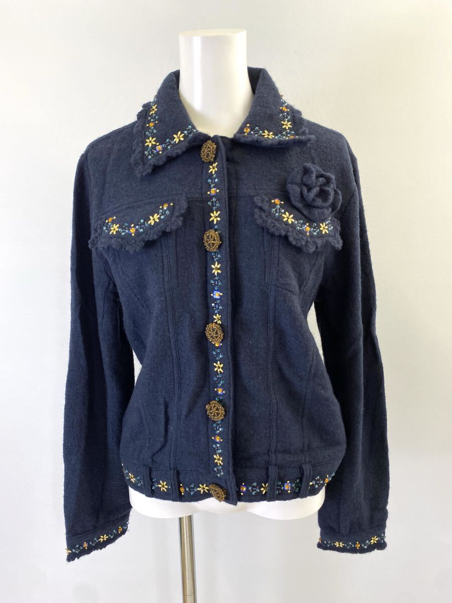 > ★ レトロ ビーズ装飾 ジャケット ネイビー Mサイズ (ブローチ付) ◆ BEREK ニットブルゾン Gジャン型 カーディガン ◆W27 KあLN6-11