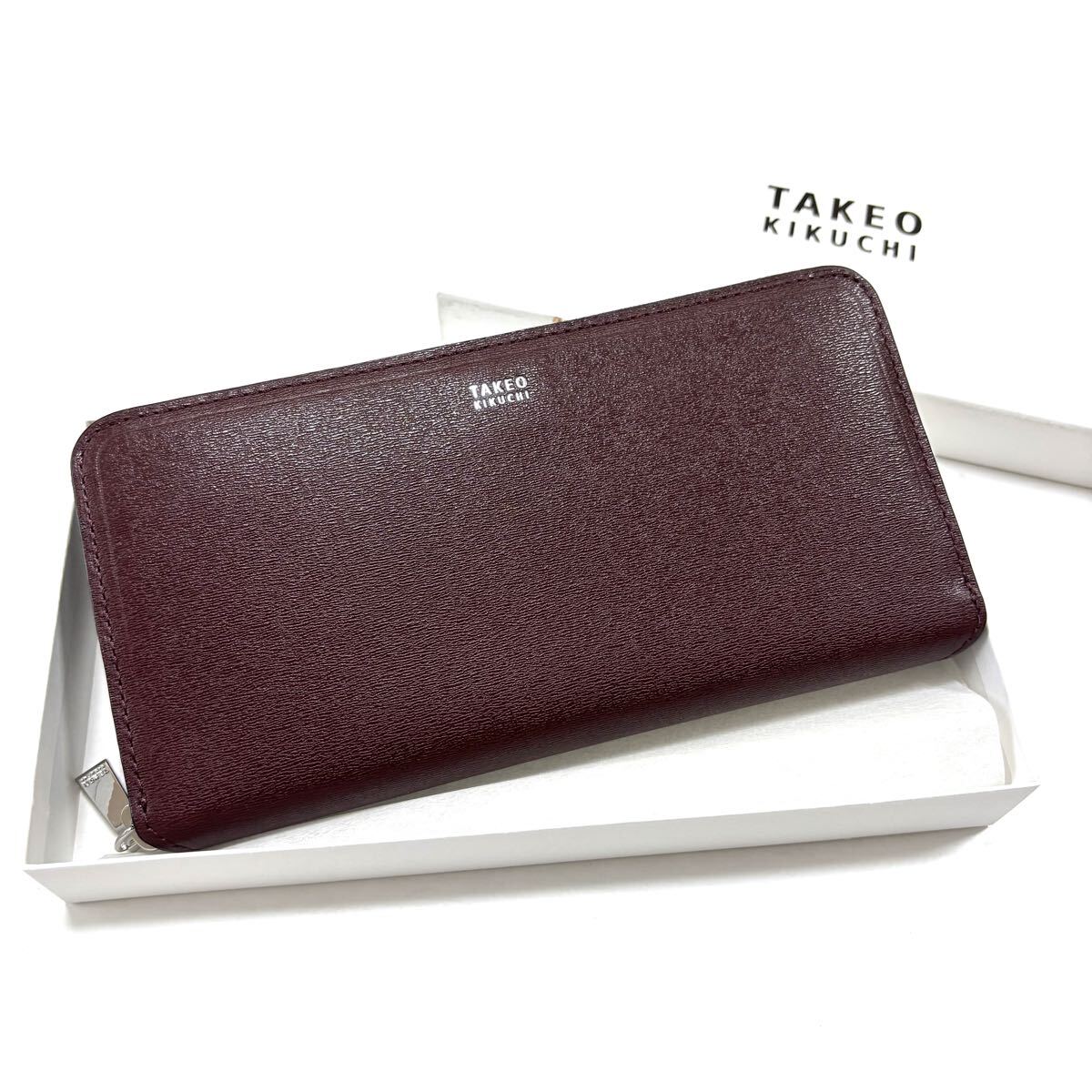 - 新品箱付 タケオキクチ 長財布 ラウンドファスナー 定価2.2万 ボルドー 定価1.9万 728616