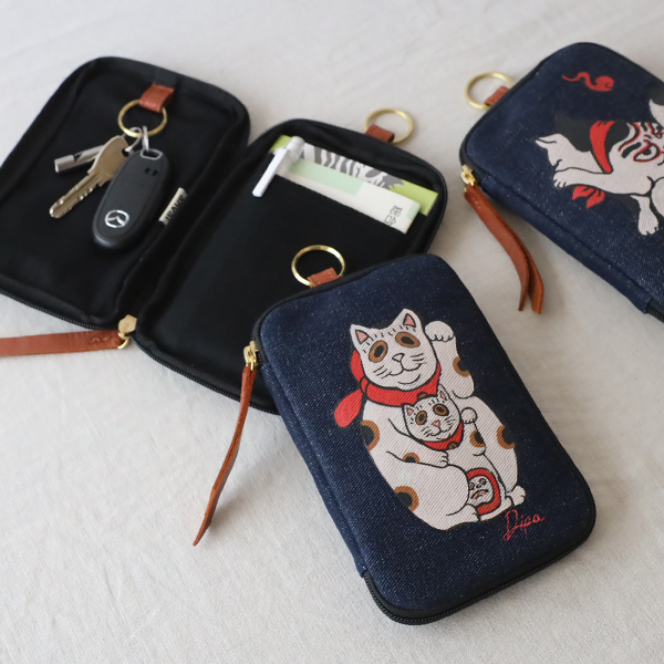 - 芸術の秋SALE Lサイズ 手描きART クッション 厚地インディゴデニム キーケース お薬手帳ケース 招き猫 レザー S07A
