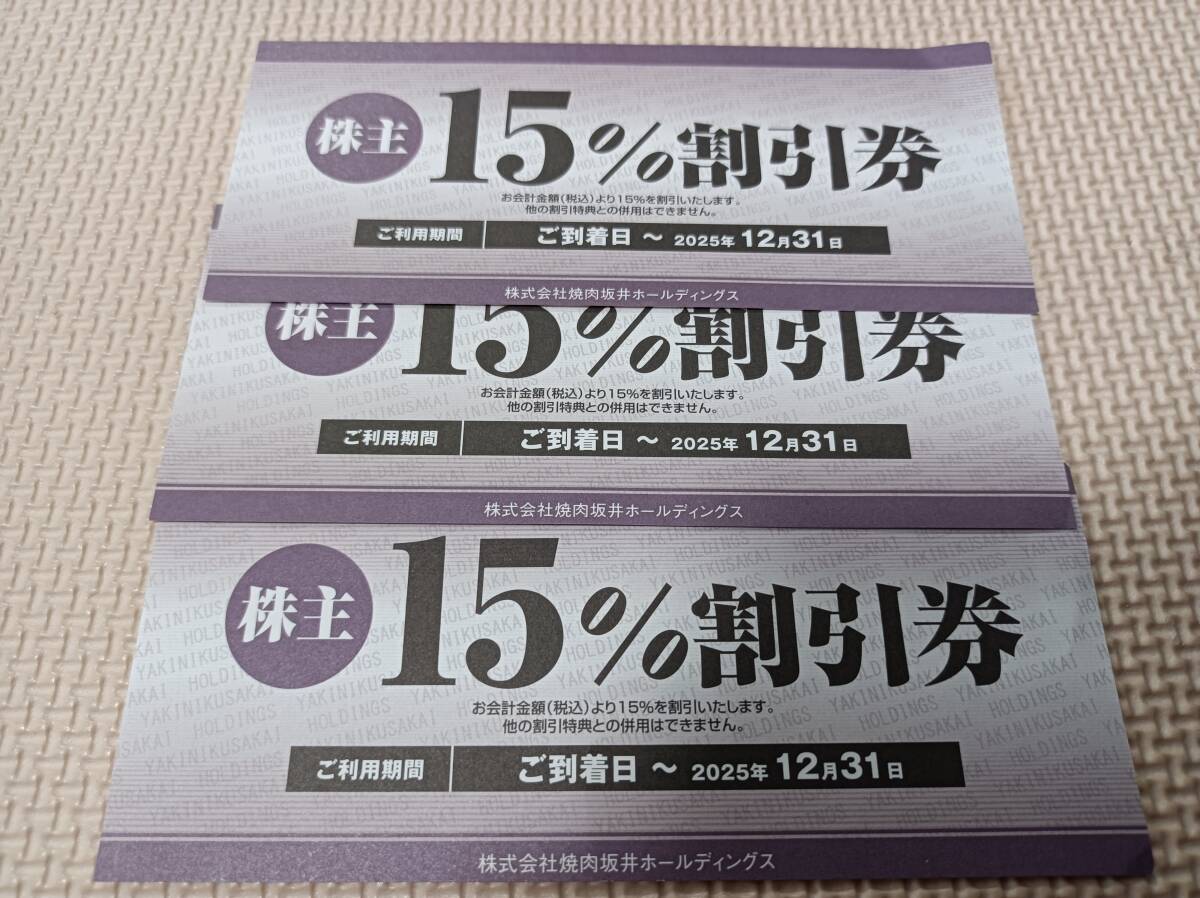 - ☆焼肉坂井ホールディングス 株主優待15%割引券×3枚 2025年12月31日まで 匿名発送