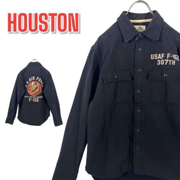 - 【レア】HOUSTON ヒューストン U.S.AIR FORCE ミリタリー 長袖シャツ 黒 フェード F-15E 刺繍 軍物