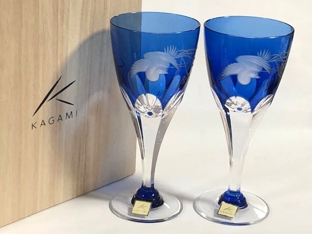 - ◎KAGAMI カガミクリスタル 色被せ切子 ロイヤルブルー ペアワイングラス「鳳凰彫刻」◎木箱入z57