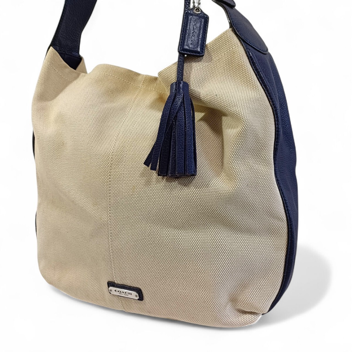 - 正規品 コーチ COACH ワンショルダーバッグ タッセル キャンバス ベージュ トートバッグ 肩掛け ハンドバッグ ネイビー 紺 男女兼用 かばん