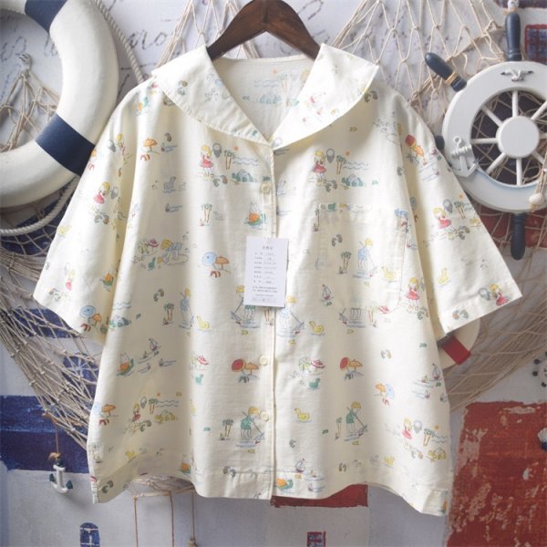 - rm 2508 ブラウス フリーサイズ ワイシャツ チュニック トップス 綿100% 大人可愛 ナチュラル サラサラ 通気性肌触り抜群 プリント柄1