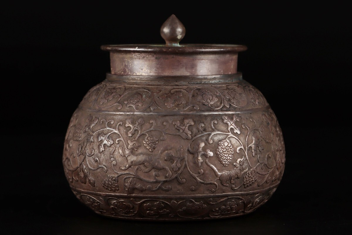- 「唐代 純銀 彫り 纏枝花卉葡萄獣紋 粉小罐」極細工 擺件 賞物 古美術 骨董品 蔵出