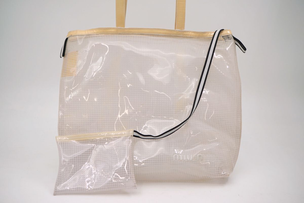- ミュウミュウ ショルダー バッグ トート プール ビーチ ポーチ付き ブロックチェック パテント レザー ビニール アイボリー MIUMIU 3437h