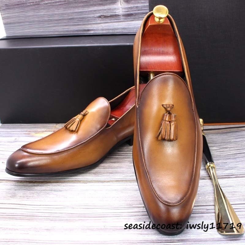 - 極美品◆新品 ビジネスシューズ メンズ タッセルローファー 職人手作り 本革 スリッポン レザーシューズ 牛革 革靴 紳士靴 ブラウン 25.5cm