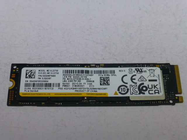 > Samsung SSD M.2 NVMe Type2280 Gen 4.0x4 2TB(2048GB) 電源投入回数2700回 使用時間777時間 正常100% 中古品です MZVL22T0HBLB-00BL7⑤