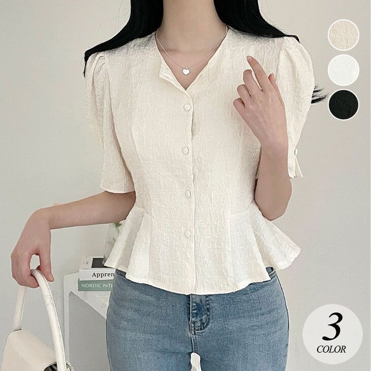- パフスリーブ 半袖 シャツ ブラウス 春 夏 フリル ラウンドネック トップス プリーツ おしゃれ きれいめ カジュアル フレア 韓国