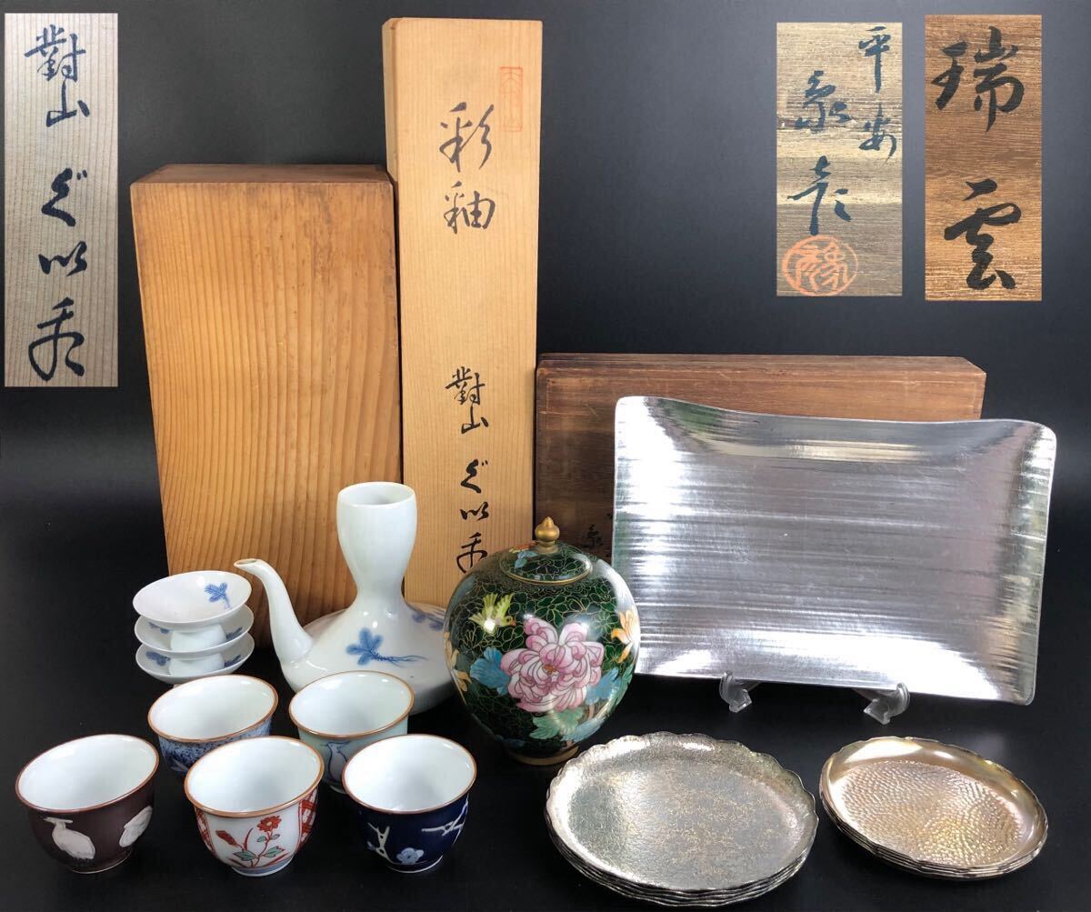 > ★酒器 彩釉 有田焼 酒徳利 花柄歌付き壺 お猪口 青山 象彦 AZUMA 小皿 木箱付き 現状品 まとめ★442★er1062