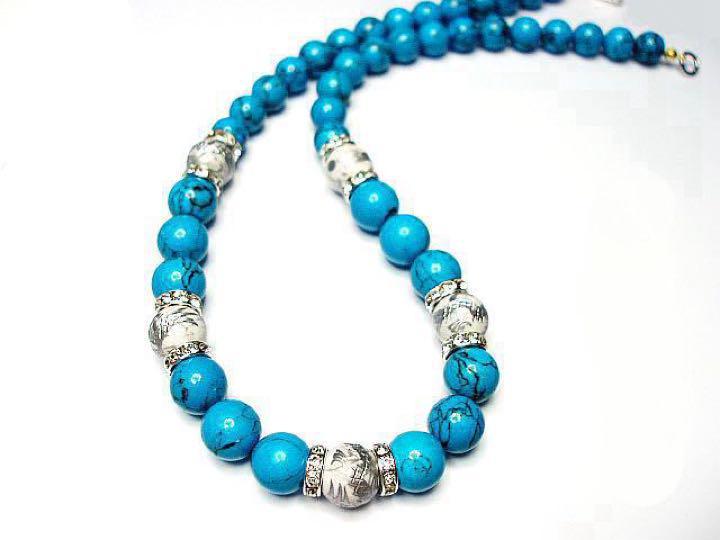 - 天然石昇龍手彫り銀箔水晶ホワイト青ターコイズ12ミリネックレスプライム