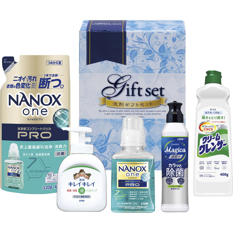〇注意事項・送料800円が販売価格に含まれています・お取り寄せ商品です。弊社にて手配後、メーカー・卸業者からの直送になります。・まれにメーカー欠品、出荷遅延等が発生致します。問題発生時は別途メールにてご連絡致します。・配送方法の指定、日時指定、置き配、ギフト対応、他商品との同梱配送などは対応できません。・まとめ買いや複数購入の場合は通常より発送に時間が掛かる場合がございます・複数個口の場合、2階以上への搬入ができない場合があります。(その場合は1階での受け渡しとなります)・大型連休、お盆、年末年始などは発送をお休みさせていただく場合がございます・メーカー都合により、パッケージは予告なく変更される場合がございます・梱包用のダンボールはリサイクル品を使用させていただきます。・注文に関するご連絡(注文確定通知・発送通知など)はメールでご案内させていただきます※商品ページの内容について、少しでもご不明な点などがございましたら購入前に一度ご連絡ください〇商品説明あらゆるギフトシーンにおすすめです!衣類の汚れ・ニオイを徹底洗浄するライオンナノックスワンブロを主体とした液体洗剤ギフト〇商品仕様●内容:ライオンナノックスワンプロ:380g・詰替:320g・ライオンチャーミーマジカ速乾プラス:220mL・ライオンキレイキレイ薬用液体ハンドソープ:250mL・クリームクレンザー:400g×各1規格●化粧箱入(188×245×105mm) 1920g●加工地:日本(出典:株式会社 八大)