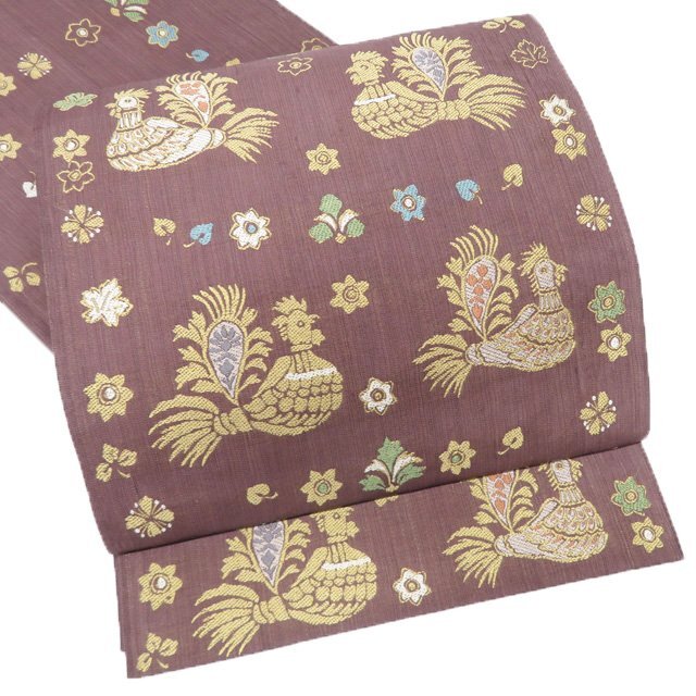 - 袋帯 中古 リサイクル 正絹 紬地 カジュアル 仕立て上がり 六通 鳥と花模様 煤竹色 多色 きもの北條 A1266-13