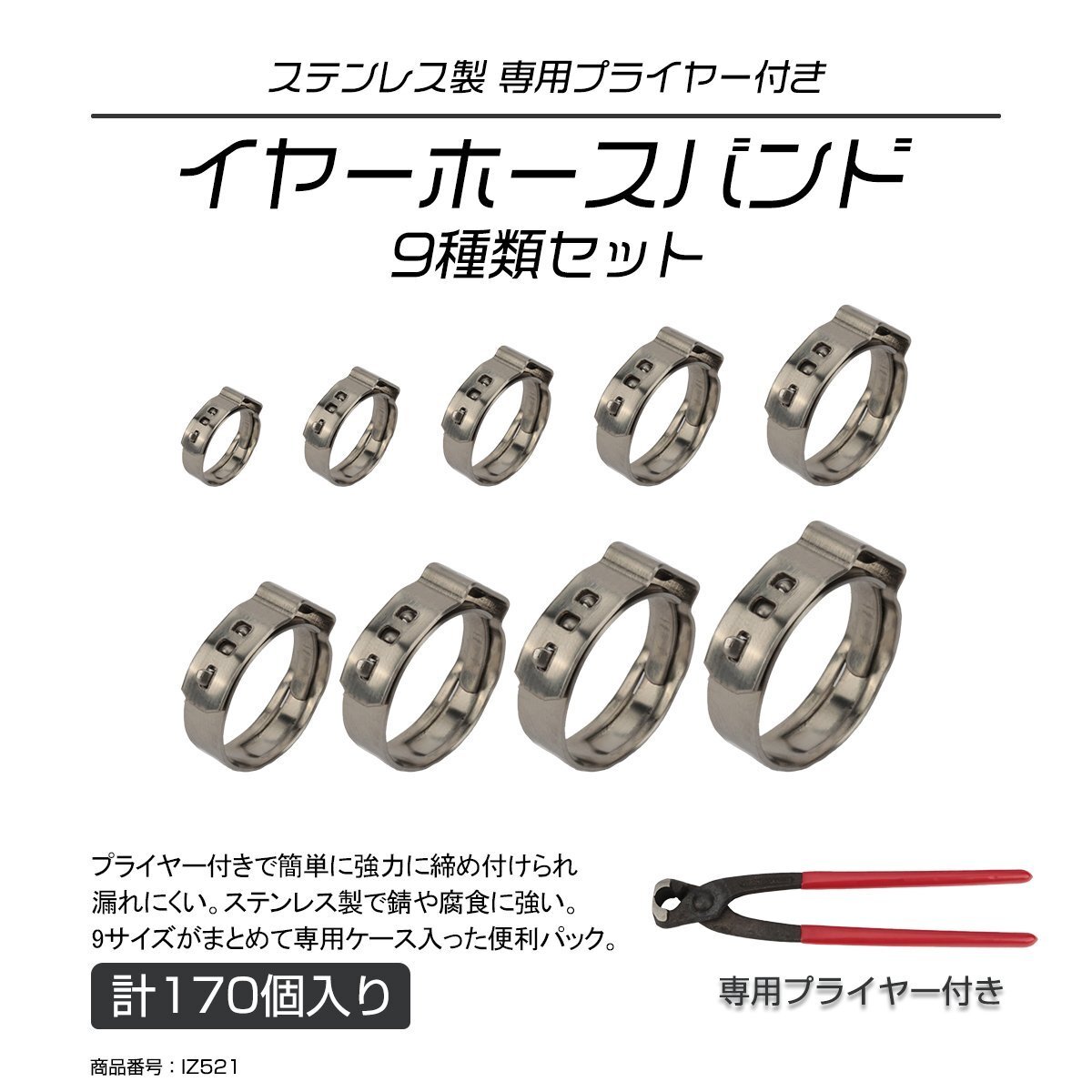 - イヤー クランプ ホースバンド ステンレス製 9種類 170個セット プライヤー付き ケース入り ホースの固定に IZ522